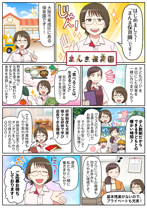 大阪市東成区のまんま保育園では、保育士さん・看護師さん・調理員さんを募集しています。とにかく子供が好き!そんな明るい方を募集しています。現役・新卒の方はもちろん、結婚・出産で保育の仕事を離れてしまいブランクがある方も大歓迎です!正社員・パートの両方を募集していますので気になる方はお気軽にお問い合わせください。